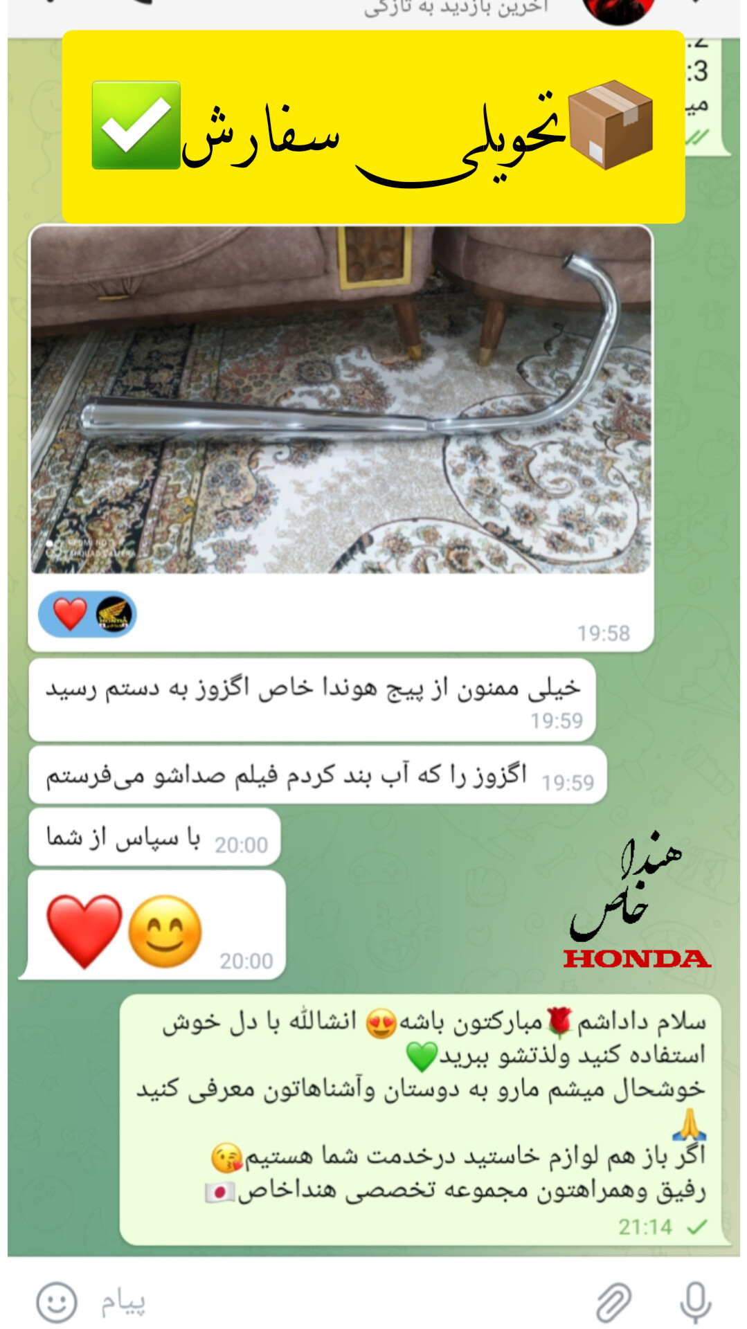 این اگزوز دارای توری های تقویت شده که در اثر گاز دادن ومسافت های طولانی خراب نمیشود و ضمانت دارد